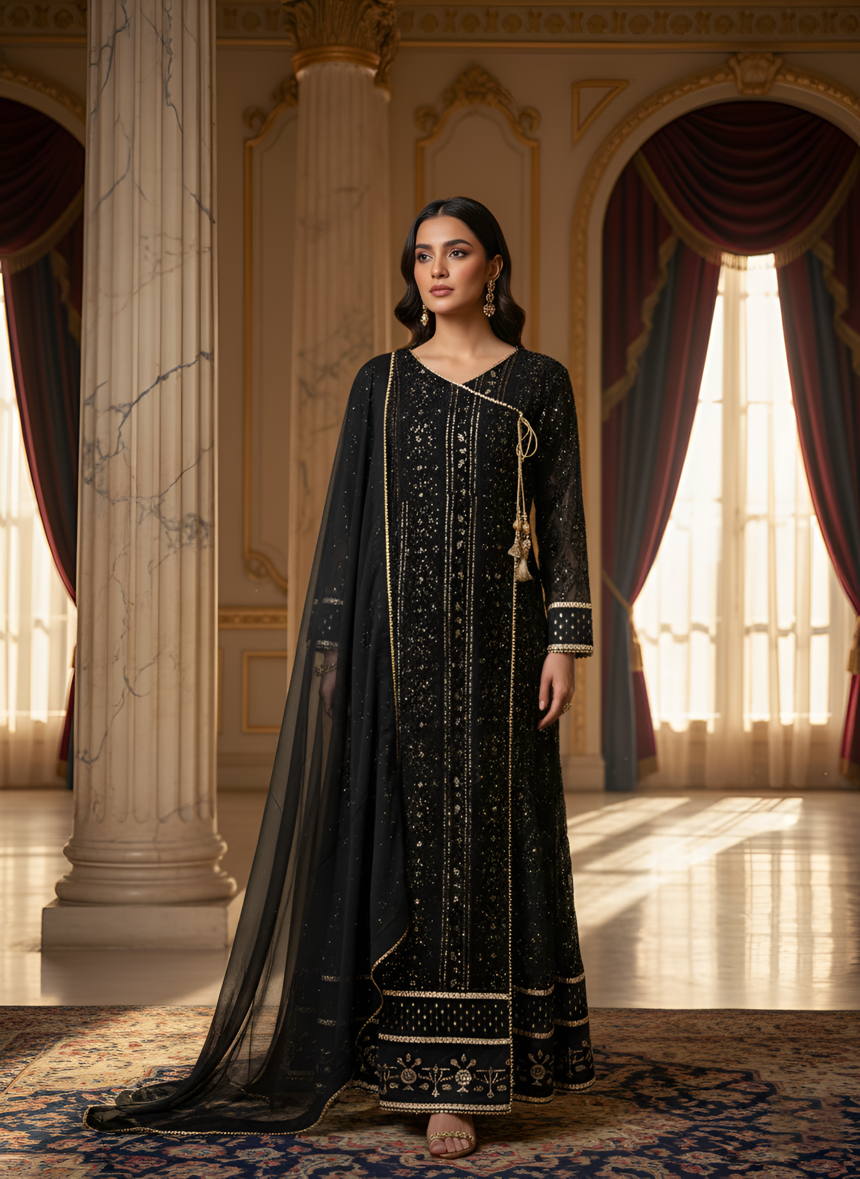 An elegant maxi dress featuring delicate embellishments and a flowing silhouette. Designed with a flattering neckline and full sleeves, it comes with a matching sheer dupatta for a refined, timeless look. Perfect for festive occasions, weddings, and evening events.